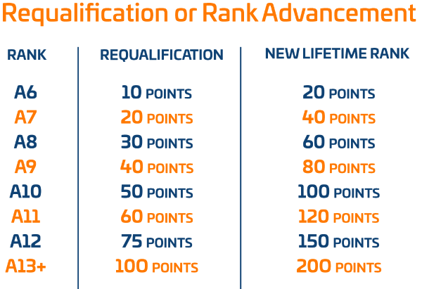 Personal Rank Requalification or Advancement from rank A6 (maximum 200 points possible).
